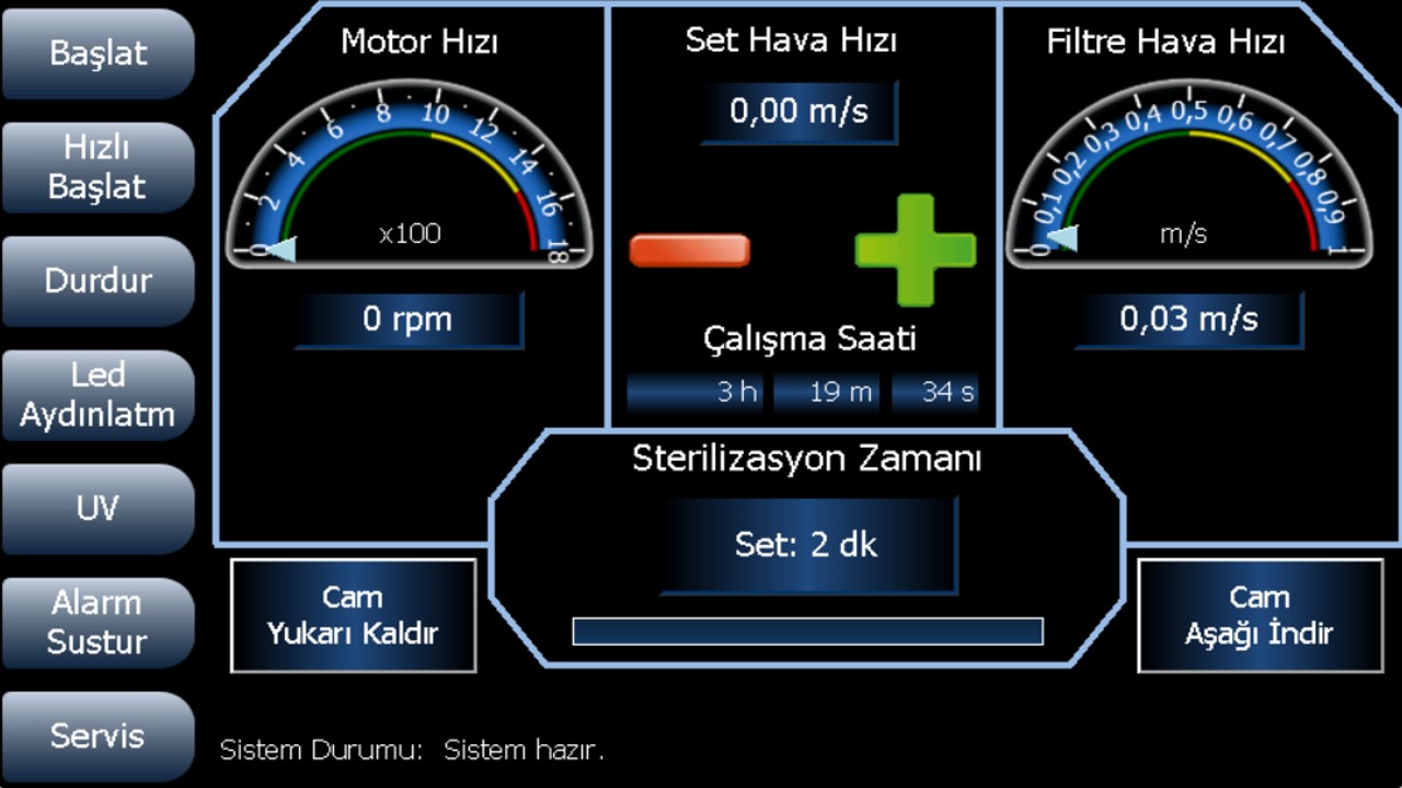 • Hata durumları ve düşük-yüksek hava akış hızı için sesli ve görsel alarm